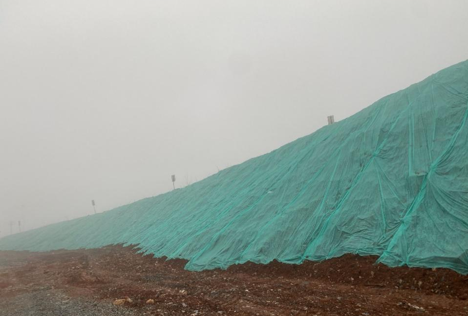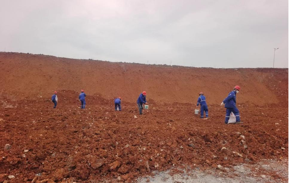 為持續(xù)做好生態(tài)修復工作我礦在2024年1月份開始對375、390平臺禁采區(qū)邊坡陸續(xù)覆土,于同年3月全面完成覆土工作。同時根據(jù)據(jù)土壤理化性質、礦區(qū)氣候等因素選擇合適植被,選取了播種寬葉草、狗牙根,紫橞槐、金雞菊、銀合歡等九種植物,同時扦插楊樹枝條;實現(xiàn)了草木、灌木、喬木多種植被結合,達到生態(tài)平衡,形成結構和功能穩(wěn)定的生態(tài)系統(tǒng)。為保障種子能夠順利發(fā)芽成長,永豐礦購買綠化無紡布覆蓋,在保護種子的前提下,從根源降低礦山揚塵情況。
