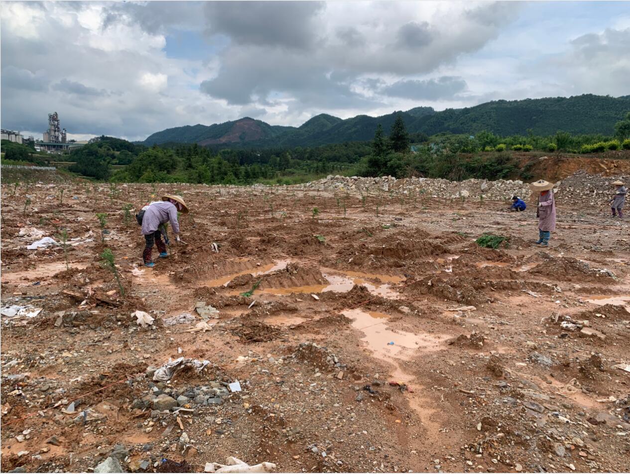 現(xiàn)由礦山主要負責人羅慧牽頭,對錦屏礦的排土場進行復(fù)綠。本次復(fù)綠從5月3日開展至5月12日,一共進行10天。復(fù)綠排土場面積為2.5畝,共種植杉樹苗1500棵,松樹苗100棵,邊坡撒播草種四季青40斤。